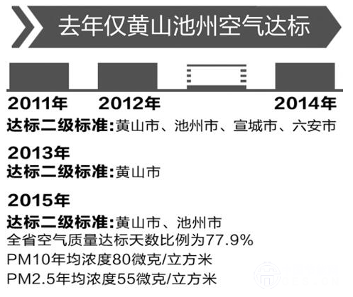5月8日,安徽省環(huán)保廳環(huán)境科學研究院與安徽財經大學聯合發(fā)布《安徽生態(tài)文明建設發(fā)展報告-大氣污染防治專題報告》,報告顯示,安徽省的空氣污染形勢比較嚴峻,在2005年-2014年安徽省僅黃山空氣質量優(yōu)良率達100%,2015年我省全面執(zhí)行空氣質量新標準后,當年只有黃山與池州兩市空氣質量達標,PM2.5污染問題日益嚴峻。