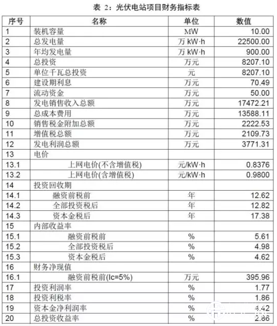 假設(shè)項(xiàng)目單位造價(jià)為8000元,裝機(jī)容量10MW,依據(jù)以上條件測(cè)算,在沒有政府補(bǔ)貼的情況下,該項(xiàng)目融資前稅前收益率在5.61%之間,投資不滿足要求,具體見下表。如單位造價(jià)降低至6800元,項(xiàng)目融資前稅前收益率達(dá)到8%,具備投資條件。因此在河南省投資光伏電站應(yīng)做好前期資源分析,選擇資源豐富地區(qū)進(jìn)行開發(fā)。