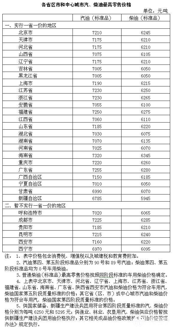 附:各省區(qū)市和中心城市汽、柴油最高零售價格表