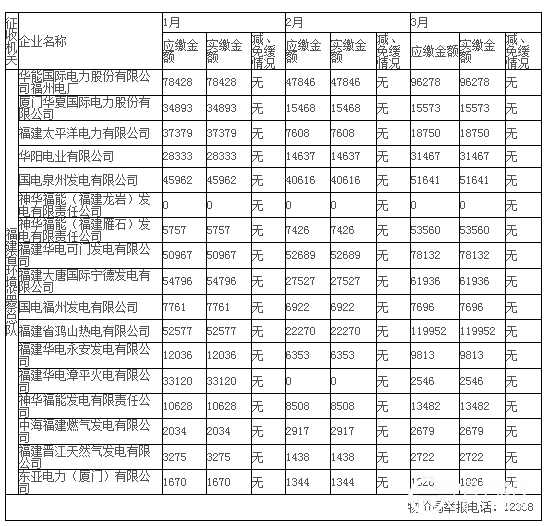 福建省30萬千瓦以上火電廠二氧化硫排污費(fèi)2016年第一季度征收情況公示