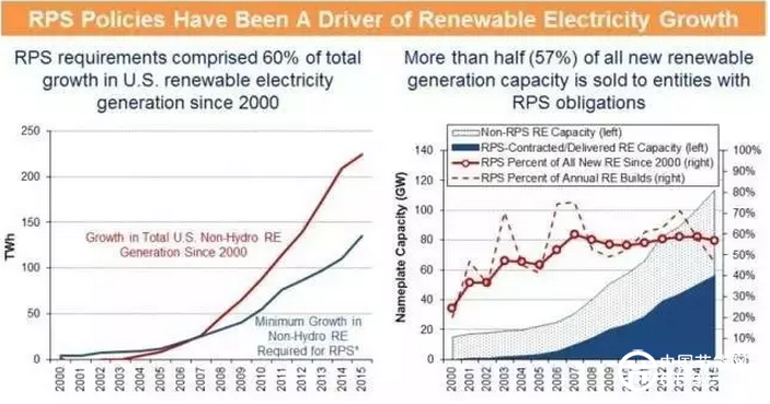 自2000年以來有超過一半的可再生能源發(fā)電量(60%)是源于各州可再生能源配額制政策的出臺(tái)。
