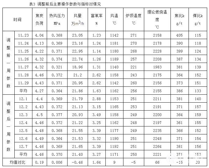 去年11月30日開始進行調(diào)整爐況,表3是11月23日至29日與12月1日至7日主要操作參數(shù)與指標(biāo)對比。從表3看出,焦炭負(fù)荷在幅度上升,熱風(fēng)壓力略有升高,風(fēng)量略有下降,富氧率大幅度增加,風(fēng)溫提高,爐頂溫度降低,理論燃燒溫度在幅度升高,焦比降低,煤比提高。主要操作參數(shù)與主要經(jīng)濟技術(shù)指標(biāo)表明:爐況趨于穩(wěn)定,能耗降低,與實際情況相一致,該解決方案可行。