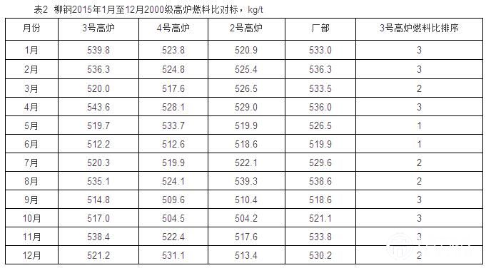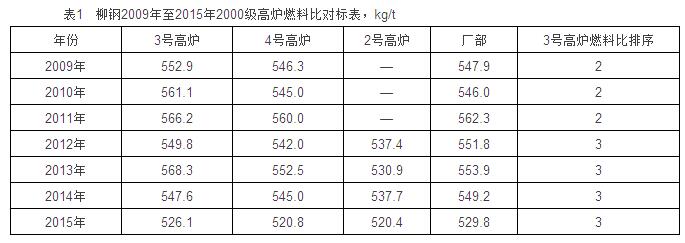 2008年兩座2000m3高爐建成投產(chǎn)(3、4號高爐),柳鋼跨入2000m3級大高爐生產(chǎn),2012年9月2650m3高爐(2號高爐)建成投產(chǎn),從此該廠擁有三座2000m3級高爐。表1是2009年至2015年7年生產(chǎn)時間2000m3級高爐燃料比、全廠燃料比對標(biāo)表。表1顯示3號高爐燃料比在3座2000m3級高爐排序中處于末位,與指標(biāo)較好的同類型高爐相比存在較大差距。