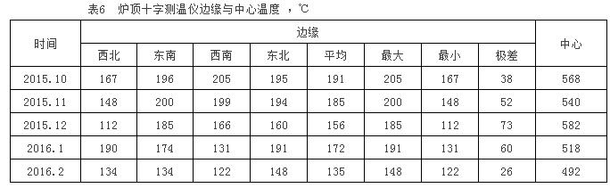 從爐頂十字測溫儀監(jiān)測情況對比分析,爐頂煤氣流逐由邊緣不均勻中心粗大無力型煤氣流發(fā)展成中心氣流集中邊緣氣流過弱型。從表6看出十字測溫儀邊緣溫度趨于均勻偏低,極差值減小,中心溫度也向弱。