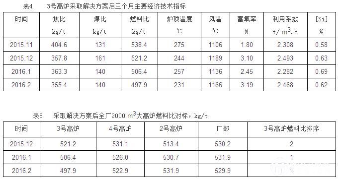 該爐經(jīng)過三個月實際運,對主要經(jīng)濟技術(shù)指標(biāo)進行對標(biāo)分析。表4是該高爐去年11月至今年2月的主要經(jīng)濟技術(shù)指標(biāo),表5是全廠2000m3大高爐燃料比對標(biāo)。從表4、表5中看出,該高爐主要經(jīng)濟技術(shù)指標(biāo)持續(xù)改善,燃料比逐步躍升為全廠第一名,今年2月份燃料比達到497.9kg/t歷史最好水平,實踐證明該解決方案達到了預(yù)效果。