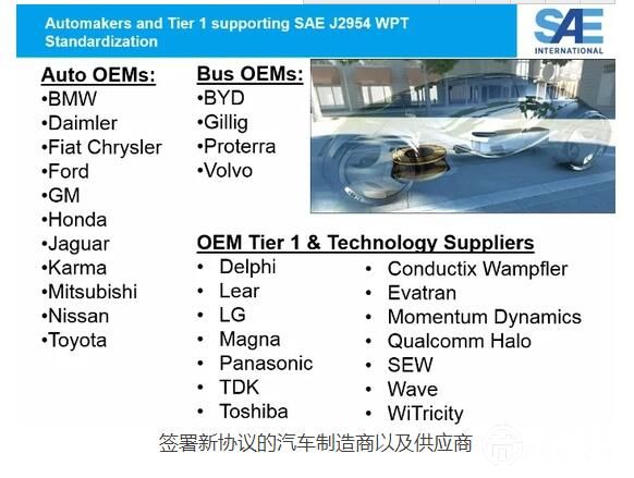現(xiàn)行的SAEJ1772標(biāo)準(zhǔn)是插電式充電方面的規(guī)范,并由絕大多數(shù)汽車制造商采用。而接受新的TIRJ2954無(wú)線充電標(biāo)準(zhǔn)的汽車制造商包括戴姆勒(寶馬)、菲亞特-克萊斯勒、福特、通用、本田、捷豹路虎、三菱、日產(chǎn)以及豐田。這些已簽署協(xié)議的汽車制造商們的電動(dòng)汽車目前占市面上絕大多數(shù)。據(jù)悉,一些位于行業(yè)供應(yīng)鏈第一等級(jí)的原始設(shè)備制造商(OEM)們,比如德爾福、LG、松下、東京電氣化學(xué)TDK等也都簽署了新的無(wú)線充電協(xié)議。同時(shí),生產(chǎn)應(yīng)用于巴士的插電系統(tǒng)廠家,包括沃爾沃、比亞迪以及美國(guó)電動(dòng)公交車公司普羅泰拉(Proterra)等,也共同簽署了該項(xiàng)協(xié)議。
