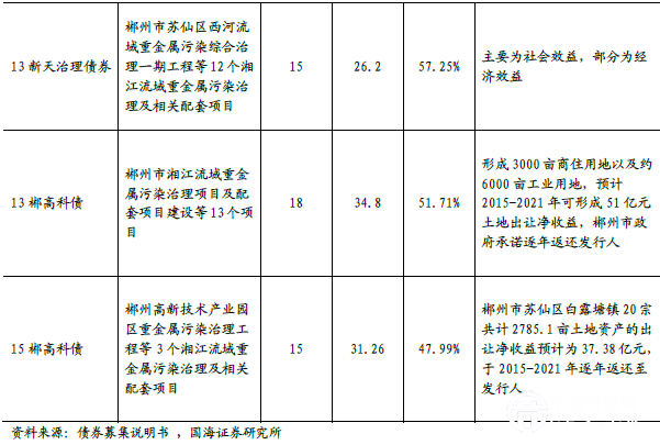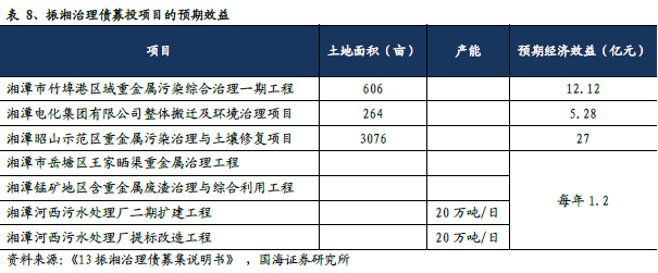 專項(xiàng)債募資占比約五成,社會(huì)效益、經(jīng)濟(jì)效益突出。湘江流域治理的驅(qū)動(dòng)力主要是社會(huì)效益和經(jīng)濟(jì)效益。湘江流域因“鎘大米”事件而備受關(guān)注,重金屬污染對(duì)流域的農(nóng)業(yè)影響巨大,改善土壤環(huán)境本身就有很大的社會(huì)效益。另外,根據(jù)各專項(xiàng)債募集說明書,大部分有較好的預(yù)期收益、償付保障,債券的償付來源主要是土地流轉(zhuǎn)價(jià)值、政府回購等,預(yù)期收益可觀。以13 振湘治理債為例,募投項(xiàng)目修復(fù)完成或達(dá)產(chǎn)后,預(yù)期能產(chǎn)生44.4 億元的土地經(jīng)濟(jì)效益和每年1.2 億元的利潤,在還本付息后,仍有較好的收益。我們認(rèn)為,重金屬污染地區(qū)采用中央專項(xiàng)資金與治理專項(xiàng)債結(jié)合的方式募集資金具有一定的可借鑒性,修復(fù)治理后產(chǎn)生的土地經(jīng)濟(jì)效益一般可覆蓋專項(xiàng)債的本息。