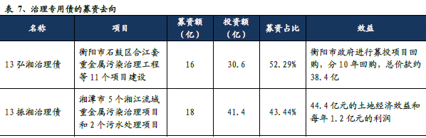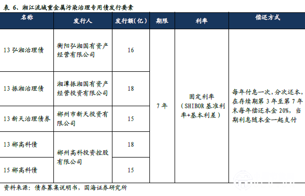 湘江流域治理:發(fā)行治理專用債彌補(bǔ)資金缺口。湘江流域作為我國重金屬污染最嚴(yán)重的地區(qū)之一,一直是土壤修復(fù)領(lǐng)域關(guān)注的熱點(diǎn)區(qū)域,對(duì)資金的需求較大。郴州市環(huán)保局相關(guān)官員曾表示,中央及地方專項(xiàng)資金占比不足30%,資金的缺口較大。對(duì)此,湖南地方政府發(fā)行了多個(gè)治理專用債,其中2013 年發(fā)行債券的募資金額達(dá)到67 億元,后續(xù)又發(fā)行了新的治理專用債。這些債券的償付特征基本一致,地方政府通過發(fā)行專項(xiàng)治理債,較好地解決了湘江流域重金屬污染治理的資金缺口問題。