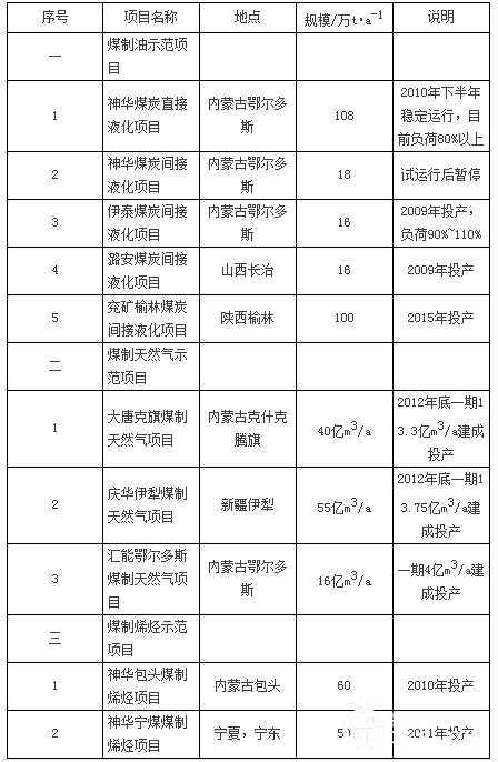 表1 中國已投產(chǎn)的主要現(xiàn)代煤化工項目情況