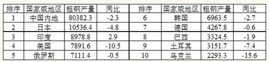 2015年,中國內(nèi)地全年生產(chǎn)粗鋼8.04億噸,比上年減產(chǎn)1917.98萬噸,下降2.33%。2015年長材產(chǎn)量下降3.60%,管材產(chǎn)量增長10.98%,板帶材產(chǎn)量增長2.50%,其中冷軋薄板增長6.49%,鍍層板增長2.67%。粗鋼產(chǎn)量下降,部分高端產(chǎn)品產(chǎn)量增長,中國鋼鐵工業(yè)產(chǎn)品結構有所優(yōu)化。2015年,世界66個主要產(chǎn)鋼國家和地區(qū)共生產(chǎn)粗鋼16億噸,比上年下降2.86%。主要產(chǎn)鋼國家粗鋼產(chǎn)量多數(shù)下降,僅有少數(shù)國家粗鋼產(chǎn)量增長,見表1。主要產(chǎn)鋼國家粗鋼產(chǎn)量單位:萬噸、%