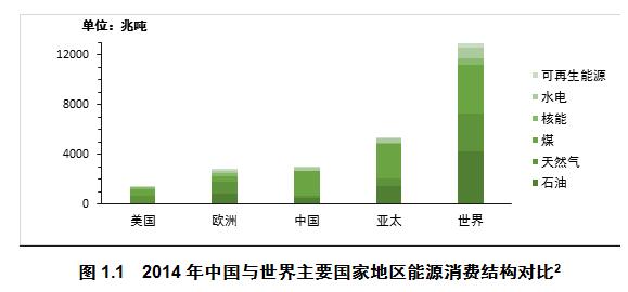 現(xiàn)階段,我國(guó)能源消費(fèi)總體呈現(xiàn)總量大、結(jié)構(gòu)失衡以及利用效率低的特點(diǎn)。以2014年為例,我國(guó)能源消費(fèi)量位居世界首位,體量近乎整個(gè)歐洲的年消費(fèi)量。此外,長(zhǎng)期粗放式的經(jīng)濟(jì)發(fā)展模式也使我國(guó)對(duì)煤炭等一次能源依賴(lài)程度高,2014年煤炭占能源消費(fèi)總量的66%,而可再生能源消費(fèi)占比卻不到1.8%。盡管我國(guó)能源利用效率逐年提升,但絕對(duì)水平仍在國(guó)際上處于低位,2013年我國(guó)每萬(wàn)美元GDP能耗為1.89噸油當(dāng)量,相當(dāng)于印度上世紀(jì)90年代中期水平。[1]若未來(lái)能耗繼續(xù)大幅增長(zhǎng),環(huán)境的承受力勢(shì)必將制約經(jīng)濟(jì)發(fā)展,對(duì)此中國(guó)政府早在2009年宣布控制溫室氣體排放目標(biāo)并規(guī)劃2020年的單位GDP能耗將比2010年降低31%。