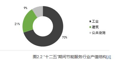 “十二五”期間,我國(guó)節(jié)能服務(wù)行業(yè)發(fā)展迅速,總產(chǎn)值從587.68億元增長(zhǎng)到2650.37億元,復(fù)合增速達(dá)35.16%。工業(yè)、建筑、公共設(shè)施三大領(lǐng)域?qū)偖a(chǎn)值的貢獻(xiàn)率分別為70%、21%、9%。