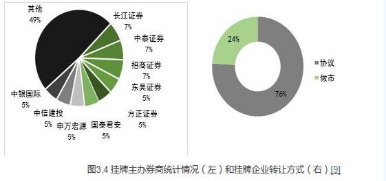 圖3.4掛牌主辦券商統(tǒng)計(jì)情況(左)和掛牌企業(yè)轉(zhuǎn)讓方式(右)[9]