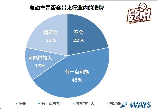 北京車展時新浪汽車針對這些問題向數(shù)十家車企一把手發(fā)起調查,近四分之三的老總認為,隨著電動車市場的發(fā)展,電動車有一定可能引起行業(yè)洗牌,其中22%的老總認為雖然目前電動車銷量欺負不定,但是一定會引發(fā)行業(yè)洗牌。