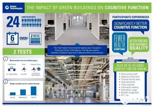 Allen教授的結(jié)論來自于哈佛大學(xué)T.H.Chan公共衛(wèi)生學(xué)院健康及全球環(huán)境中心、上州醫(yī)學(xué)院和錫拉丘茲大學(xué)的一項最新研究——“綠色建筑對認(rèn)知功能的影響”。該研究成果表明,室內(nèi)環(huán)境質(zhì)量的改善會使人們的認(rèn)知功能雙倍提高。該研究由EMSI母公司聯(lián)合技術(shù)(United Technologies)及其環(huán)境、控制與安防業(yè)務(wù)部門(UTC Climate, Controls & Security)提供支持。