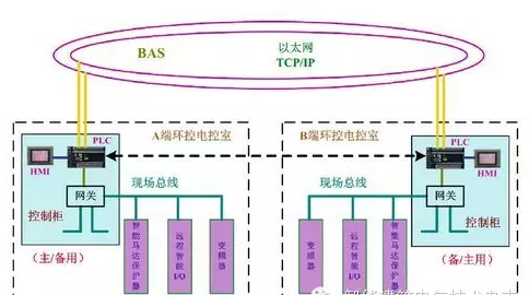PLC 通過雙工業(yè)以太網接口負責與BAS 系統(tǒng)的通信連接,將接收到的模式指令解釋后下發(fā)到相應的環(huán)控柜。A 端、B 端PLC 的CPU 通過數據同步接口構成一套冗余系統(tǒng),但是各自獨立控制自己的遠程智能I/O 站和智能馬達控制器以及變頻器。正常工作情況下,由操作員指定A 端或者B 端的PLC 為主控PLC,另外一端的PLC 為備用PLC,主控PLC 負責接收BAS 系統(tǒng)通過工業(yè)以太網下達的控制指令,通過冗余CPU 的數據同步接口傳遞給備用PLC。如果主控PLC 的BAS 系統(tǒng)通訊出現故障,系統(tǒng)將自動切換到備用PLC 接收BAS系統(tǒng)的模式控制指令并通過冗余CPU 的數據同步接口傳遞給主控PLC,同時將故障上報BAS 系統(tǒng)。環(huán)控設備控制系統(tǒng)方案如圖1 所示。