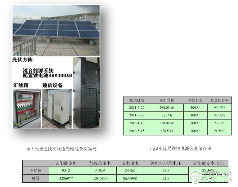 此試點(diǎn)方案中,鐵鋰電池接近每天一個(gè)充放電循環(huán),實(shí)驗(yàn)局自2011年5月建成以來,鐵電池性能良好,運(yùn)行穩(wěn)定,共計(jì)節(jié)能減排3286977Wh,達(dá)到預(yù)期節(jié)能減排30%的效果。
