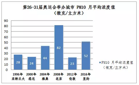 據(jù)路透社報(bào)道,北京奧運(yùn)會(huì)期間的PM10濃度值為82微克/立方米,遠(yuǎn)超過里約奧運(yùn)會(huì)。而根據(jù)倫敦政府?dāng)?shù)據(jù)顯示,2012年倫敦奧運(yùn)會(huì)時(shí),PM10濃度值為23微克/立方米。2004年雅典奧運(yùn)會(huì)PM10為44微克/米立方,2000年悉尼奧運(yùn)會(huì)為24微克/米立方,1996年亞特蘭大奧運(yùn)會(huì)為28微克/米立方。