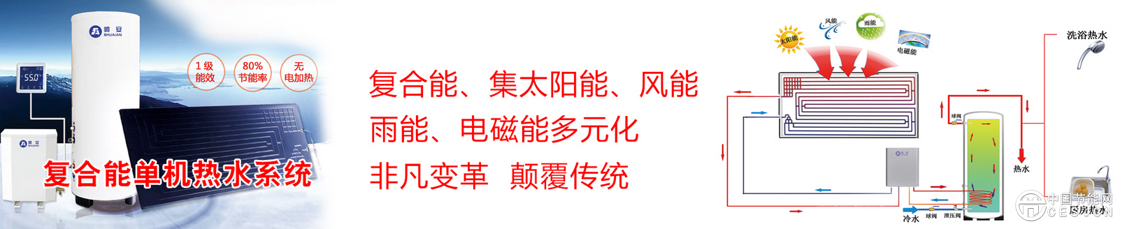 帥安復(fù)合能中央熱水系統(tǒng)利用矩陣型帥安復(fù)合能聚能板吸收太陽輻射能,可以按照客戶需求訂制各種規(guī)格水箱,特殊要求還可以配置輔助電加熱,系統(tǒng)高度靈活能夠滿足用戶的不同需求,保證全年全天候提供熱水。可廣泛用作賓館、體育場館、學(xué)校、企業(yè)、機(jī)關(guān)、醫(yī)院 、公共浴室等單位等的生活熱水供應(yīng)系統(tǒng),并適用于室內(nèi)泳池的池水加溫,水產(chǎn)養(yǎng)殖中用作熱水水源。 帥安復(fù)合能中央熱水系統(tǒng)熱效率更高,節(jié)能更明顯,并具有以下特點(diǎn): 1.帥安復(fù)合能聚能板采用工質(zhì)循環(huán),不但能夠高效的利用太陽能,還可以吸收風(fēng)能、雨能等環(huán)境能源,彌補(bǔ)了傳統(tǒng)太陽能集熱器天氣變化時(shí)的低效,在工程應(yīng)用方面可以做到無輔助能耗或極少輔助能耗; 2.帥安復(fù)合能聚能板厚度3mm,采用開放式雙面集熱,每塊聚能板的集熱效率高達(dá)135%,集熱面積是傳統(tǒng)太陽能集熱器的1.5倍,在同等聚能板數(shù)量的情況下將獲得更多的能量; 3.帥安復(fù)合能聚能板擁有十八項(xiàng)國家專利,由金屬板直接壓制而成,牢固可靠,不泄漏; 4.帥安復(fù)合能聚能板表面的專利流道,集熱更快速,不向外界散熱,集熱效果100%; 5.帥安復(fù)合能聚能板是最安全的聚能板,冰雹沙塵暴等天氣因素不會造成聚能板破損,而玻璃管太陽能可能會出現(xiàn)爆管炸管等安全維護(hù)問題。夏季高溫暴曬也不會造成系統(tǒng)安全問題,停機(jī)狀態(tài)聚能板與周圍環(huán)境溫度等同,可以自然發(fā)生熱交換; 6.帥安復(fù)合能聚能板重量輕,每塊不足8KG,為工程應(yīng)用節(jié)省安裝成本、占地面積以及建筑承重負(fù)擔(dān)。
