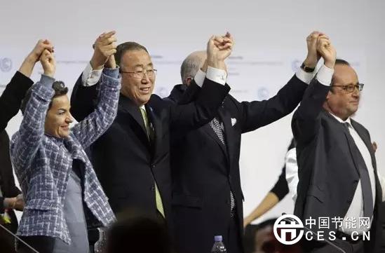 2015年12月12日,在巴黎北部市郊的布爾歇展覽中心,《聯(lián)合國氣候變化框架公約》秘書處執(zhí)行秘書菲格雷斯,聯(lián)合國秘書長潘基文,法國外交部長、巴黎氣候變化大會主席法比尤斯與法國總統(tǒng)奧朗德(從左至右)一起牽手,慶祝巴黎氣候協(xié)議達成。