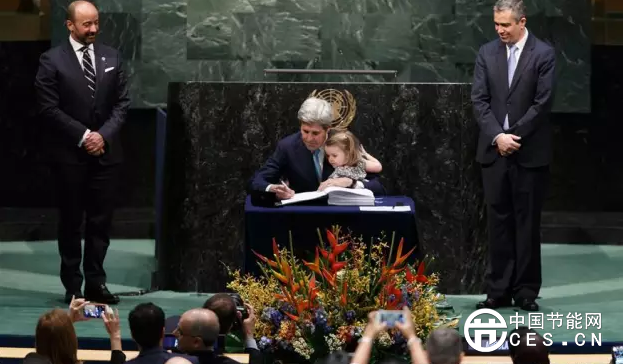 美國國務卿克里帶著孫女在《巴黎協(xié)定》高級別簽署儀式上簽署這一協(xié)定。