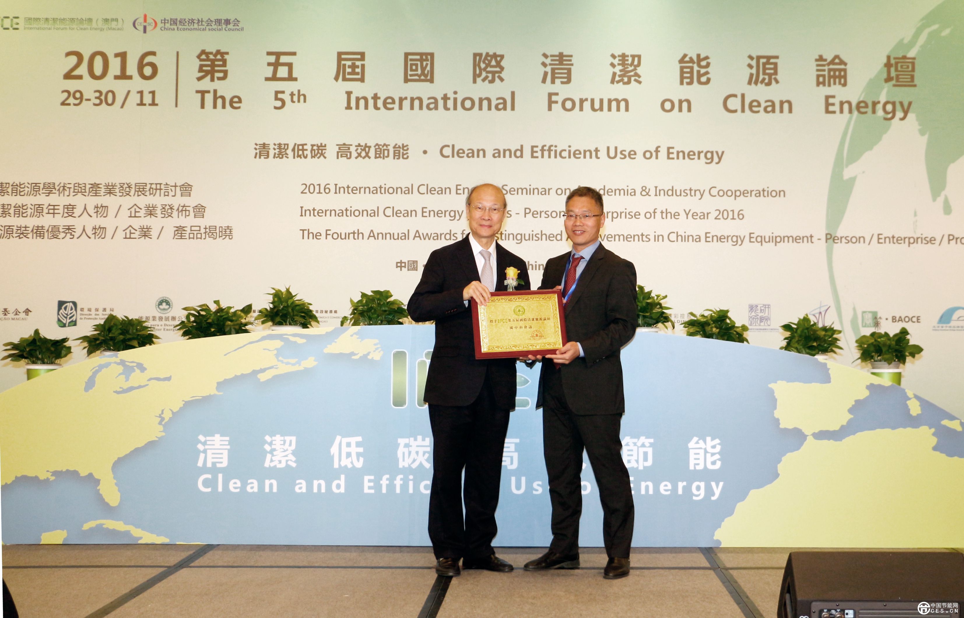 國際清潔能源論壇(澳門)理事長(zhǎng)蘇樹輝為獲獎(jiǎng)?wù)哳C發(fā)獎(jiǎng)項(xiàng)