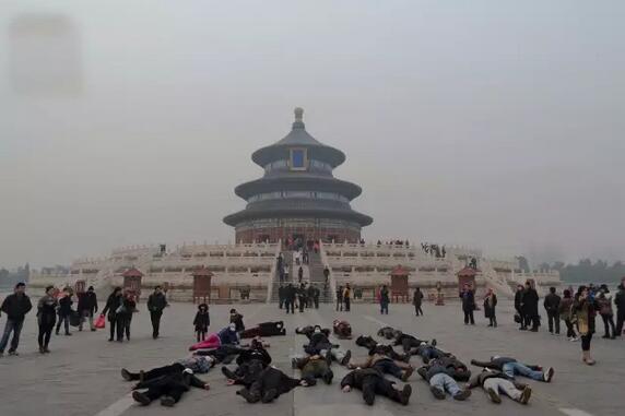北京天壇祈年殿前數(shù)名藝術(shù)家以行為藝術(shù)方式呼吁關(guān)注空氣污染,這里是中國古代皇帝祭祀上天保佑國泰民安的場所