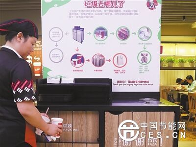 圖為一名餐廳服務(wù)員將餐后垃圾分類(lèi)投放。