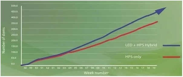 折線圖顯示每平米百合花莖累計收獲產(chǎn)量,并對高壓鈉燈照明與LED園藝照明的不同結(jié)果進行對比。
