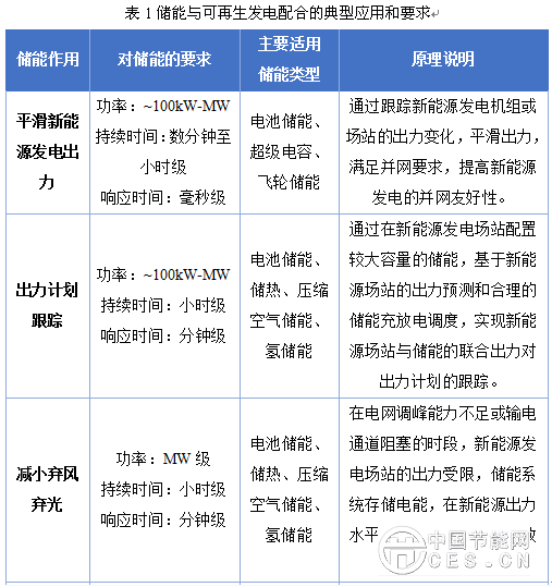 隨著可再生能源發(fā)電裝機(jī)容量的迅猛增長(zhǎng),風(fēng)力、太陽(yáng)能發(fā)電出力的隨機(jī)性和波動(dòng)性給電力系統(tǒng)運(yùn)行帶來(lái)了新的挑戰(zhàn)。此外,由于可再生能源出力的預(yù)測(cè)誤差相對(duì)較大,可再生能源發(fā)電場(chǎng)站的經(jīng)濟(jì)效益在含高比例可再生能源接入的電力系統(tǒng)中將會(huì)受到明顯的影響。電池、超級(jí)電容、飛輪、新型壓縮空氣等儲(chǔ)能系統(tǒng)具有快速調(diào)節(jié)的性能,可以安裝在可再生能源發(fā)電場(chǎng)站側(cè),起到平滑可再生能源發(fā)電出力、提高發(fā)電出力的可控性、增強(qiáng)可再生能源市場(chǎng)競(jìng)爭(zhēng)力等作用。在我國(guó)的北方地區(qū),因?yàn)檎{(diào)峰容量不足、輸電通道擁塞等原因,造成了大量棄風(fēng)、棄光問(wèn)題。如果在可再生能源發(fā)電場(chǎng)站側(cè)安裝儲(chǔ)能系統(tǒng),則可以通過(guò)儲(chǔ)能充放電的優(yōu)化控制,緩解輸電阻塞和電網(wǎng)調(diào)峰能力限制,提高可再生能源場(chǎng)站的上網(wǎng)電量。下表對(duì)儲(chǔ)能在可再生能源發(fā)電側(cè)的典型應(yīng)用和要求進(jìn)行了總結(jié)。