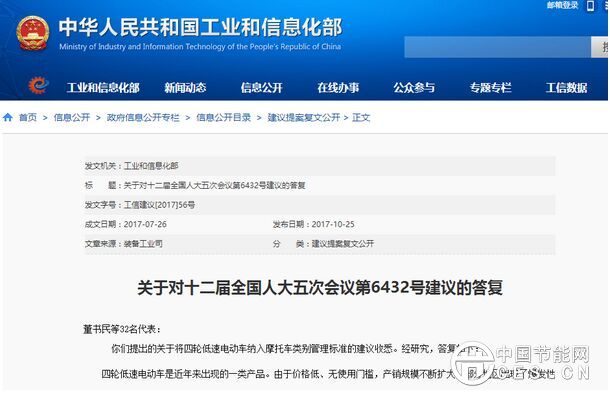 核心提示:工信部日前公布《關(guān)于對十二屆全國人大五次會議第6432號建議的答復(fù)》,就全國人大代表提出的將四輪低速電動車納入摩托車類別管理標準給出明確