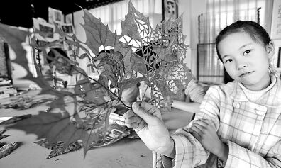 11月10日,江蘇東海縣和平路小學(xué)的學(xué)生展示創(chuàng)意“樹葉畫”,表達對大自然的熱愛。