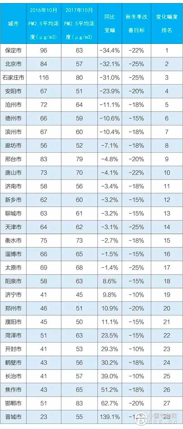 近日,環(huán)境保護(hù)部通報(bào)了2017年10月京津冀大氣污染傳輸通道城市(空氣質(zhì)量狀況。其中,從改善幅度來(lái)看,17個(gè)城市PM2.5月均濃度同比下降,另11個(gè)城市同比上升。