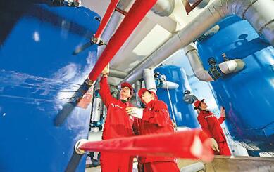 十一月十五日,河南省濮陽市某小區(qū)供熱管理人員在巡檢地?zé)峁┡O(shè)備情況。