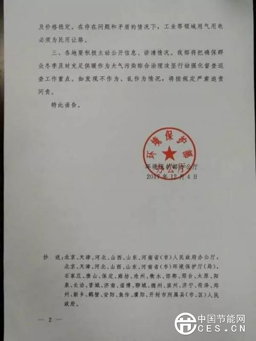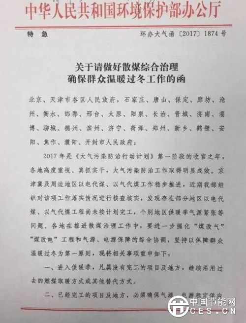 近日,環(huán)保部向京津冀及周邊地區(qū)城市下發(fā)《關(guān)于請(qǐng)做好散煤綜合治理確保群眾溫暖過冬工作的函》特急文件,明確進(jìn)入供暖季后,一些地方如果沒有完工“煤改氣”“煤改電”工程,依然可以繼續(xù)沿用過去的燃煤取暖方式或其他替代方式。文件提出“堅(jiān)持以保障群眾溫暖過冬為第一原則”。