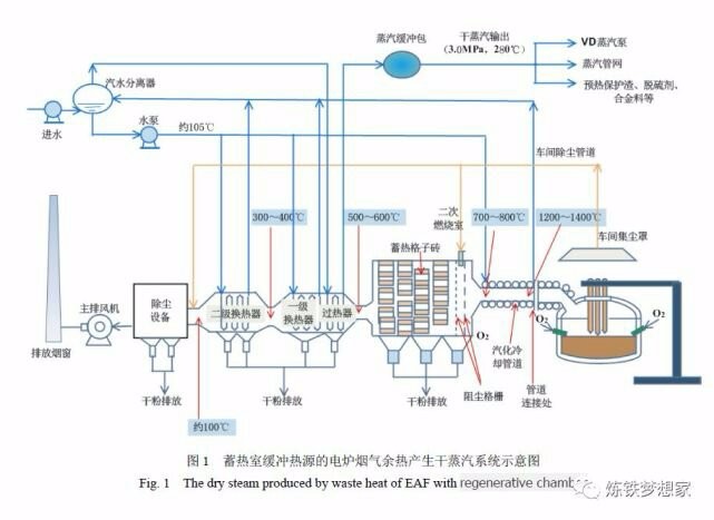 電爐煙氣攜帶了電爐能耗約30%的熱量。電爐煙氣溫度和流量呈間歇性周期變化,這給余熱回收帶來很大難度。在20 世紀90 年代,以電爐煙氣預熱廢鋼技術為主,熱量就近利用,效率高。但預熱廢鋼后煙氣溫度在200~500℃區(qū)間停留時間長,導致二噁英和呋喃重新合成;另外對已有的電爐,預熱廢鋼系統(tǒng)在現場改造工作量大,實施難度大,使得預熱廢鋼技術受阻。以蒸汽的形式回收電爐煙氣余熱技術受到重視[4~11]。將煙氣熱源的間歇性轉換為準連續(xù)性是解決電爐煙氣余熱回收難題的一個有效方法。圖1 為產生干蒸汽的電爐煙氣蓄熱緩沖熱源系統(tǒng)示意圖。從第四孔排放的煙氣經汽化冷卻煙道后進入沉降室。在沉降室入口配置阻塵格柵,對大顆粒粉塵及可燃顆粒進行粗濾。在沉降室內布置蓄熱格子磚,一方面阻擋大顆粒粉塵,另一方面存放煙氣顯熱。當煙氣溫度高時,格子磚吸收熱量;煙氣溫度低時,格子磚放出熱量。這樣可將煙氣溫度維持在500~700℃之間,使得余熱鍋爐能夠連續(xù)產生干蒸汽。