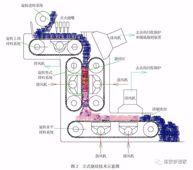 混合料經上部排料系統(tǒng)用燒嘴點燃后進入循環(huán)移動的豎式排料系統(tǒng),在豎式排料區(qū)上部的燒結區(qū)進行穩(wěn)定的燒結過程,礦料點燃后點火燒嘴關閉。燒結過程需要的風量由兩側鼓風機鼓入,經上部排風機排出后去余熱回收鍋爐和脫硫脫硝系統(tǒng)。燒結后的燒結料經循環(huán)移動的豎式排料系統(tǒng)送到循環(huán)水平排料系統(tǒng)進一步被冷卻到出料溫度排出燒結系統(tǒng)。