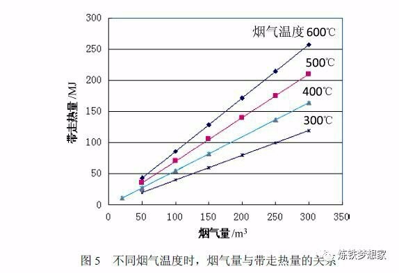工業(yè)爐(加熱爐、熱處理爐)煙氣排放帶走的熱量占工業(yè)爐總能耗20%~26%。減少煙氣排放量能夠大幅度降低工業(yè)爐能耗。當煙氣溫度為600℃時,煙氣量從300m3/h 降到150m3/h,熱量損失減少50%(見圖5)。而且煙氣排放管道大幅度減小。