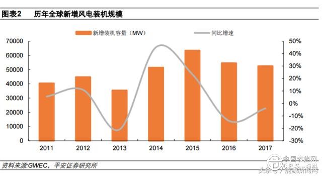 全球風(fēng)電市場(chǎng)近年呈現(xiàn)震蕩収展栺局,2015 年達(dá)到高點(diǎn)后,近兩年新增裝機(jī)有所下滑,根據(jù)全球風(fēng)能理亊會(huì)的統(tǒng)計(jì),2017 年全球新增風(fēng)電裝機(jī) 52.5GW,同比下滑約 4%。