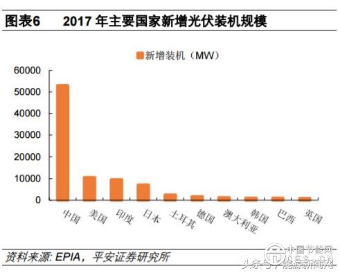 中國(guó)作為全球最大的光伏市場(chǎng),2017 年新增裝機(jī)超過(guò)全球的一半,近兩年中國(guó)市場(chǎng)基本左右了全球市場(chǎng)趨勢(shì),2016、2017 年中國(guó)市場(chǎng)的新增裝機(jī)增量占到全球市場(chǎng)增量的 70%、82%。