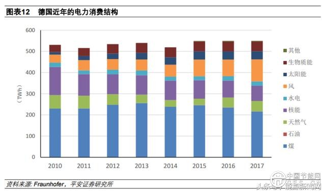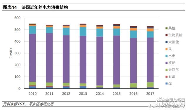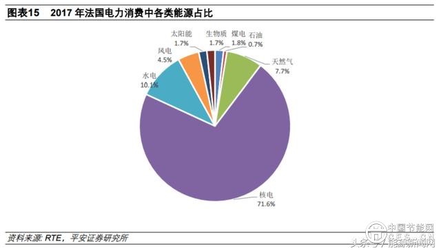2015 年,法國(guó)政府出臺(tái)《綠色增長(zhǎng)能源轉(zhuǎn)型法案》,根據(jù)該法案,到 2025 年,法國(guó)將核能収電量占電力生產(chǎn)的比例從 75%削減到 50%;到 2030 年,可再生能源占最終能源消費(fèi)量的比例從 2012 年的 13.7%提高到 32%。另外,煤電也是法國(guó)計(jì)劃削減的對(duì)象,法國(guó)總統(tǒng)馬兊龍?jiān)?2018 年達(dá)沃斯論壇収表演講時(shí)承諾,法國(guó)將在 2021 年關(guān)停所有煤電廠。在能源結(jié)構(gòu)轉(zhuǎn)型和削減核電占比的背景下,法國(guó)核電収電量占比從 2010 年的 74.1%下降到 2017 年的 71.6%,煤電從 3.5%下降到 1.8%;風(fēng)電、光伏合計(jì)的収電量占比則從 2010 年的 1.9%提升至 2017 年的 6.3%。