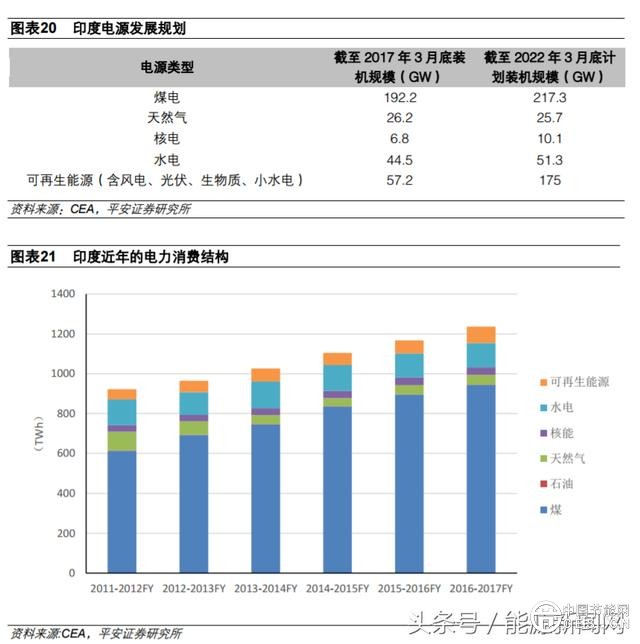 根據(jù)印度中央電力管理局 2018 年収布的《國(guó)家電力規(guī)劃(Volume1,Generation)》,印度將加快収展可再生能源,未來(lái)五年主要的新增電源為可再生能源,計(jì)劃到 2022 年將可再生能源裝機(jī)提升至 175GW(其中太陽(yáng)能 100GW,風(fēng)電 60GW)。