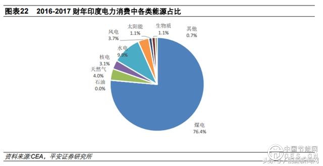 與中國(guó)類似,印度近年的収電量持續(xù)較快增長(zhǎng),2016-2017 財(cái)年収電量相比 2011-2012 財(cái)年增長(zhǎng) 34%。從電力結(jié)構(gòu)來(lái)看,由于近年主要的収電增量來(lái)自煤電,印度煤電収電量占比仍在不斷提升, 2016-2017 財(cái)年達(dá) 76.4%,較 2011-2012 財(cái)年增長(zhǎng) 10 個(gè)百分點(diǎn)。盡管近年印度的風(fēng)電、光伏也収展較快,但基數(shù)較小,2016-2017 財(cái)年風(fēng)電、光伏合計(jì)的収電量占比僅 4.8%,尚未明顯影響到其他電源的収展。