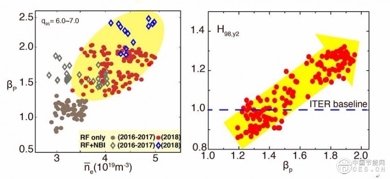 ▲2018年度EAST實(shí)現(xiàn)的運(yùn)行區(qū)拓展及能量約束增強(qiáng)因子同ITER基本運(yùn)行模式的對比。