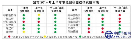 按照國家節(jié)能降耗年度目標(biāo)任務(wù)要求,通過對各盟市節(jié)能情況的分析,大部盟市節(jié)能形勢較好,但部分盟市能耗水平不降反升,節(jié)能形勢不容樂觀。上半年,呼倫貝爾市、烏蘭察布市、烏海市、阿拉善盟等4個盟市預(yù)警等級為一級,節(jié)能形勢十分嚴(yán)峻;呼和浩特市預(yù)警等級為二級,節(jié)能形勢比較嚴(yán)峻;包頭市、興安盟、通遼市、赤峰市、錫林郭勒盟、鄂爾多斯市、巴彥淖爾市等7個盟市預(yù)警等級為三級,節(jié)能進(jìn)展基本順利。