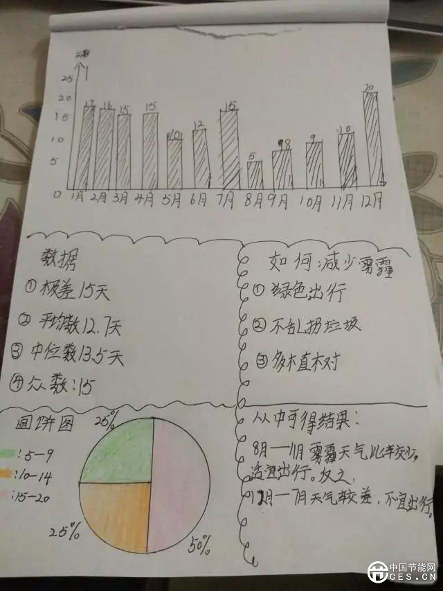 王同學(xué)利用條形圖和圓餅圖兩種方式統(tǒng)計了數(shù)據(jù),做得不錯。在餅圖的分析中,不單單只是統(tǒng)計了各月份的霧霾天氣,而是能根據(jù)天氣給出出行建議,懂得將統(tǒng)計原理運(yùn)用到生活中,利用數(shù)學(xué)更好地為生活服務(wù),能學(xué)以致用。另外,他為減輕霧霾給出了自己的想法。
