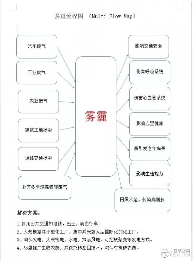 Angelina 同學(xué)選擇霧霾這個環(huán)境問題,分析它產(chǎn)生的原因和造成的結(jié)果,并使用多重流程圖呈現(xiàn),作品很有邏輯性,分兩步完成,從第一步你用多重流程圖分析霧霾形成的原因和造成的結(jié)果到最后一步給出的解決方案,整個邏輯線條非常明確。最后,她分析霧霾的原因和結(jié)果以及給出的解決方案,都很合理。