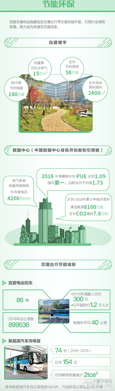 近日,百度發(fā)布《2017-2018百度企業(yè)社會責任報告》,報告中闡述了過去兩年百度在履行社會責任方面的實踐和思考,其中百度憑借領(lǐng)先技術(shù)在節(jié)能環(huán)保方面成效卓著,值得業(yè)界借鑒。報告提到,百度已在自建樓宇、綠色出行、建設(shè)綠色數(shù)據(jù)中心等方面實現(xiàn)大幅節(jié)能減排,在2018年僅通過引入清潔能源,全年CO2減排就已達到7.8萬。