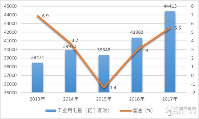 雖然我國(guó)工業(yè)綠色發(fā)展成效明顯,但工業(yè)耗能總量在社會(huì)耗能中仍然占據(jù)重要地位。以電力舉例,社會(huì)用電量主要以工業(yè)用電為主,其中2017年工業(yè)用電量占社會(huì)用電量的69.16%。2013-2017年,我國(guó)工業(yè)用電量呈總體上升趨勢(shì),其中2015-2017年工業(yè)用電量增速逐漸增長(zhǎng),預(yù)計(jì)未來(lái)工業(yè)用電量需求將穩(wěn)中有進(jìn)。