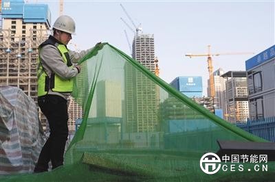 2018年2月1日,在位于北京麗澤商務(wù)區(qū)的中國鐵物大廈項(xiàng)目工地,工作人員在展示網(wǎng)眼更加細(xì)密的防塵網(wǎng)。